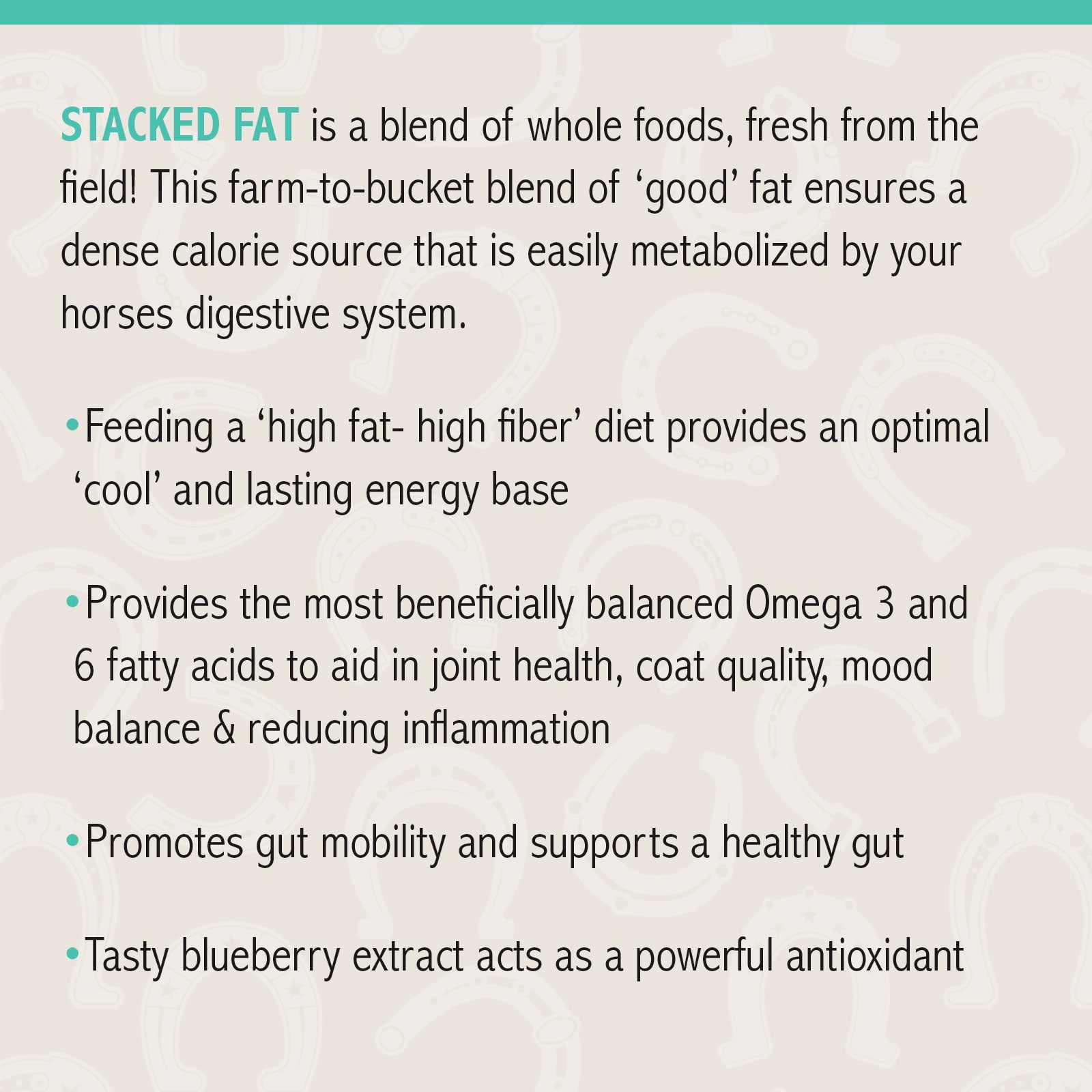 STACKED FAT is an important energy source for all horses, used to boost body condition and increase oxidative capacity.