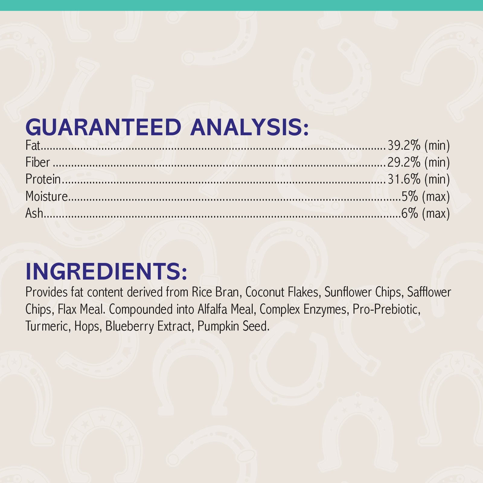 Provides fat content derived from Rice Bran, Coconut Flakes, Sunflower Chips, Safflower Chips, Flax Meal. Compounded into Alfalfa Meal, Complex Enzymes, Pro-Prebiotic, Turmeric, Hops, Blueberry Extract, Pumpkin Seed.