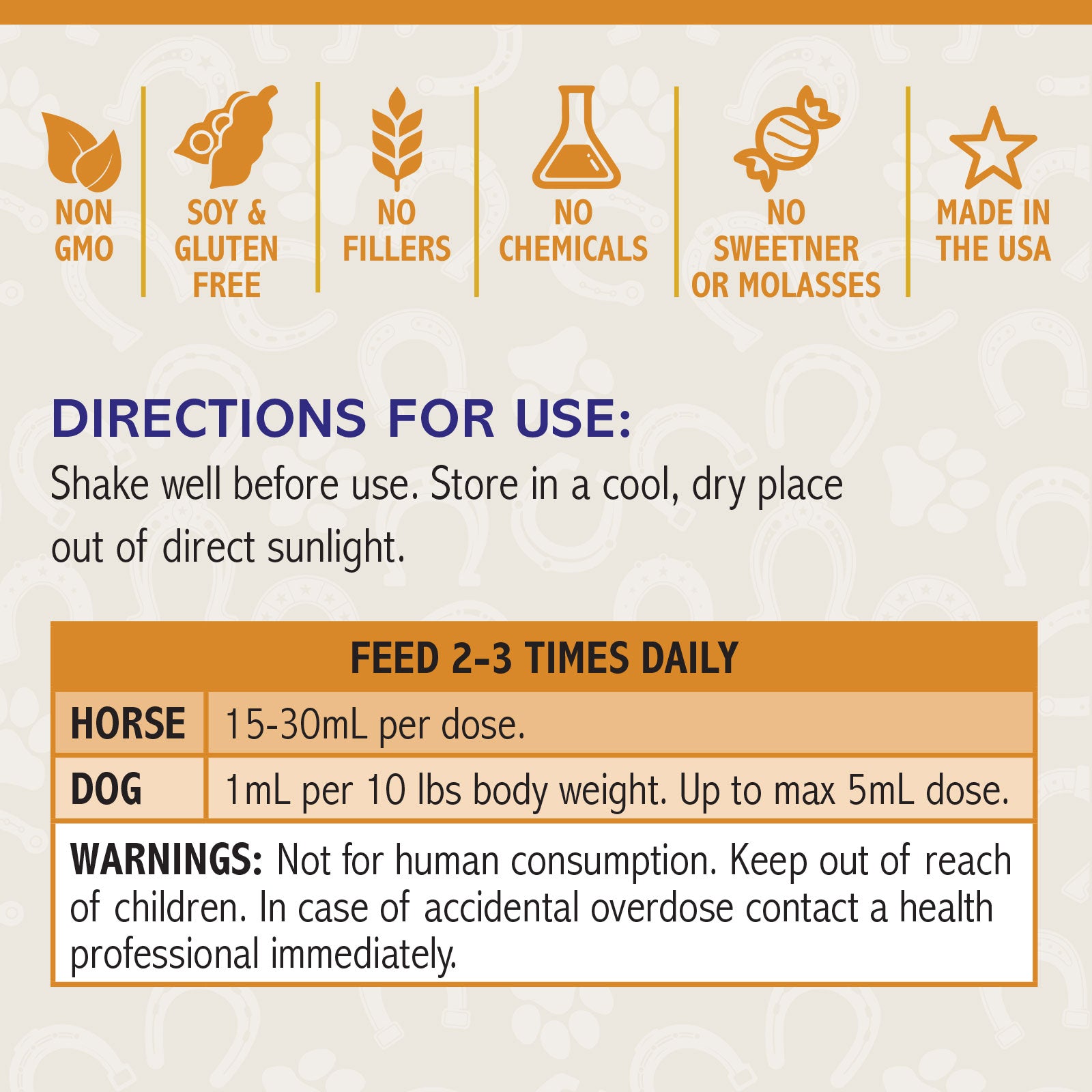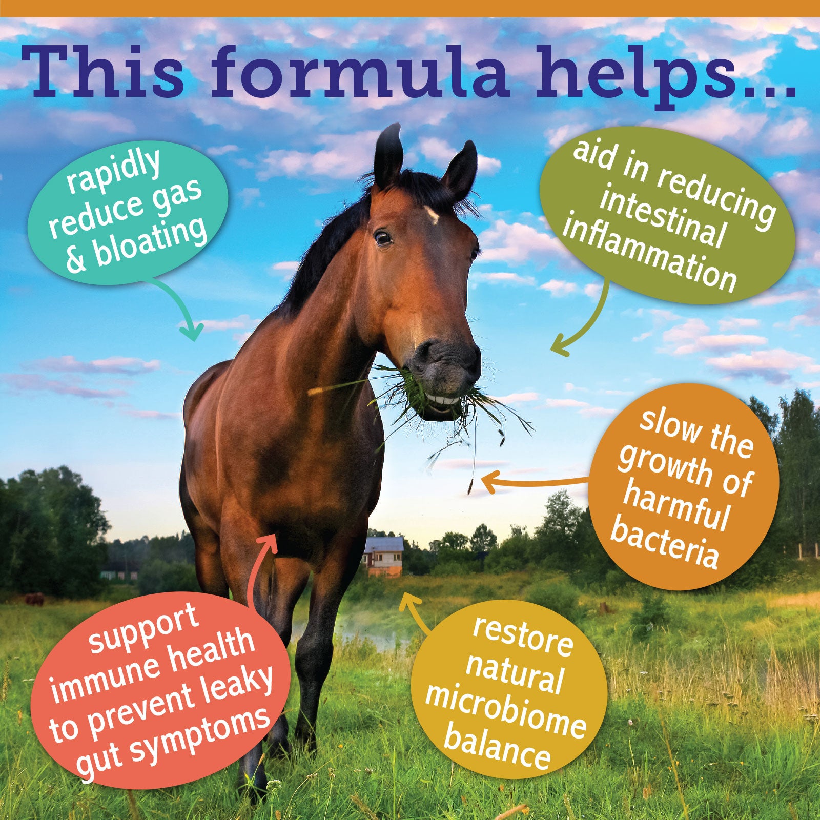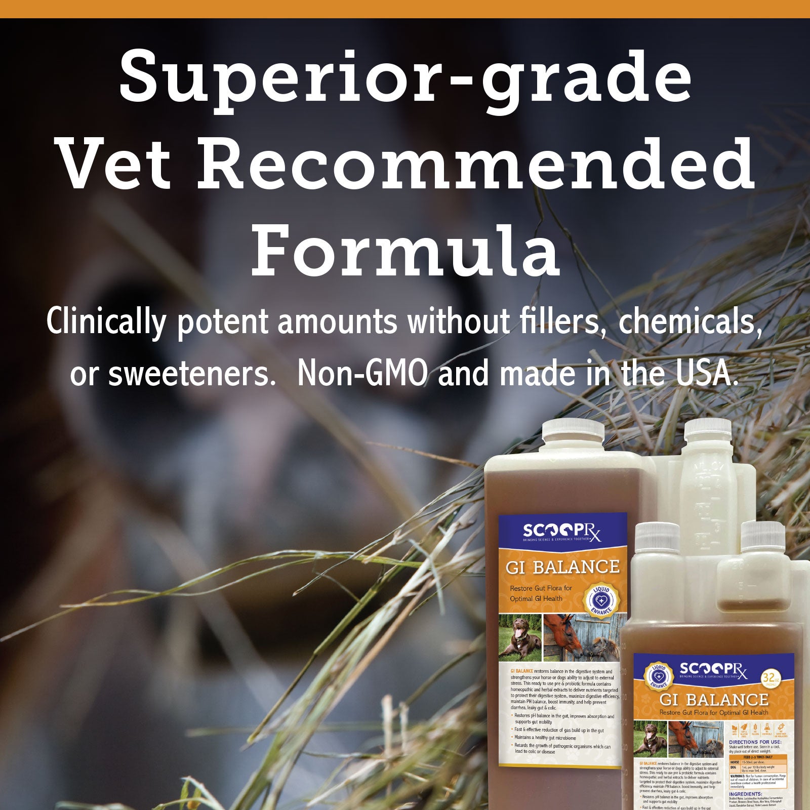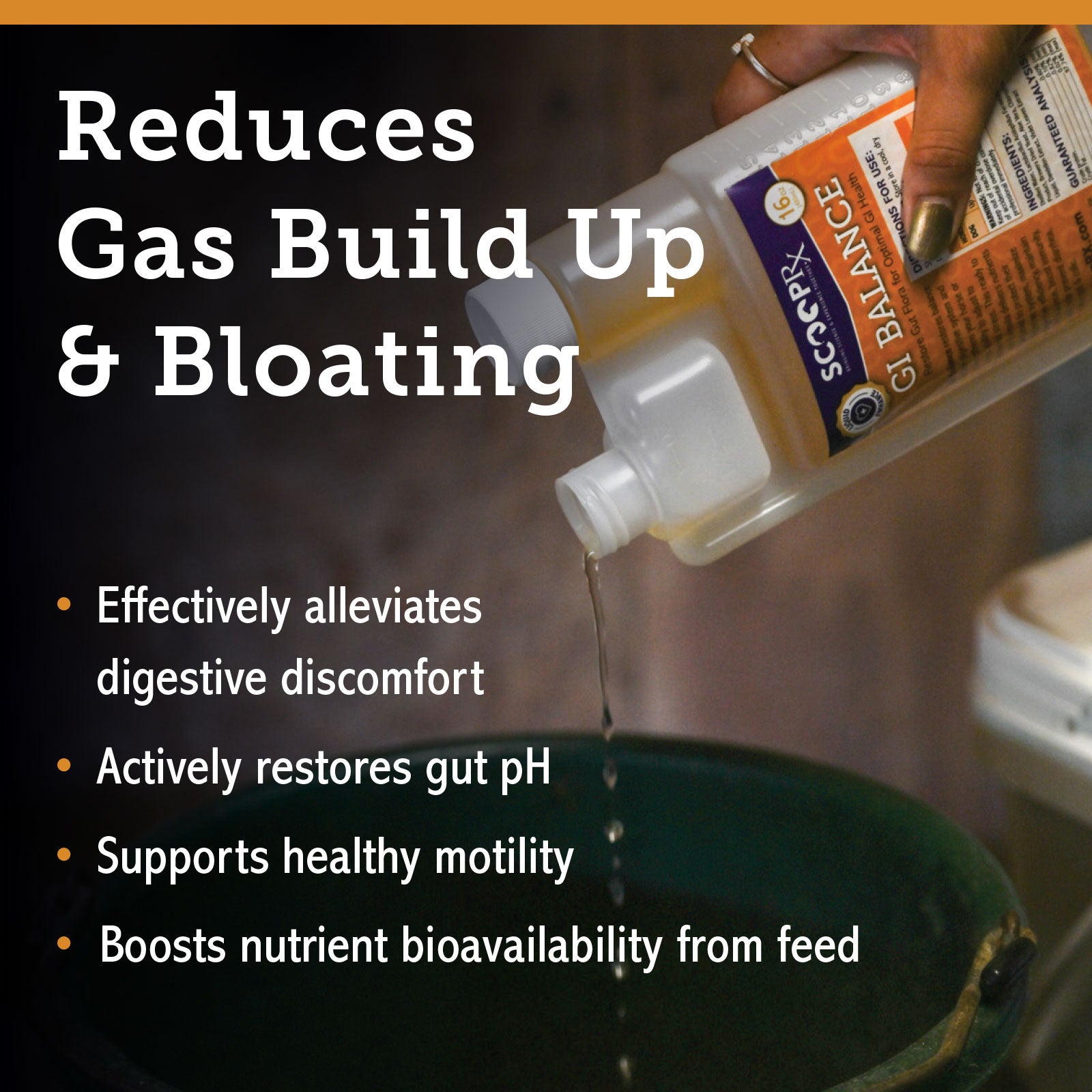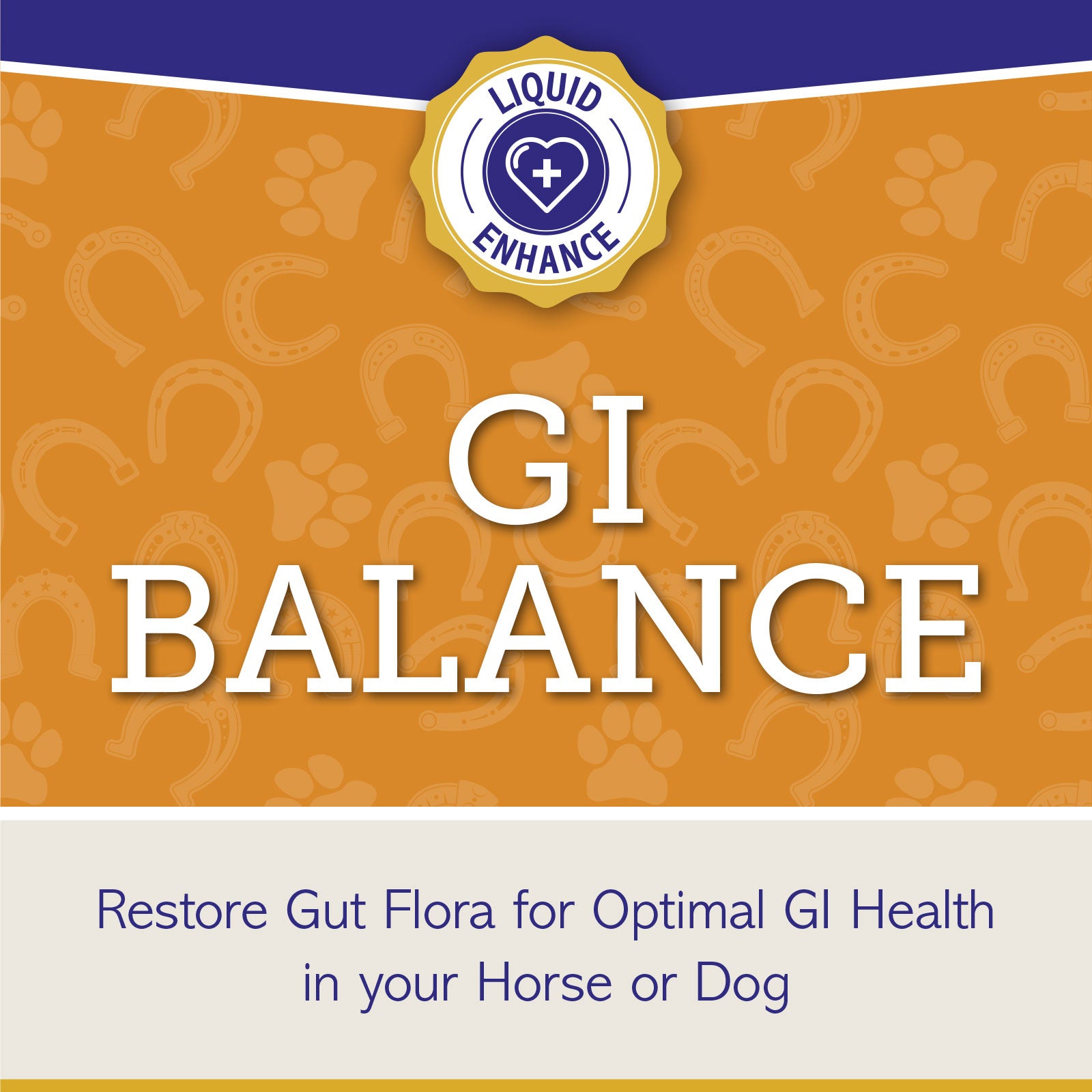 GI BALANCE is a fast-acting, palatable liquid digestive supplement designed to support horses who tend to get gas, bloating, are prone to colic, and microbial hindgut imbalance. For daily use or as-needed gut support. Also safe for dogs (see dosing guidelines).