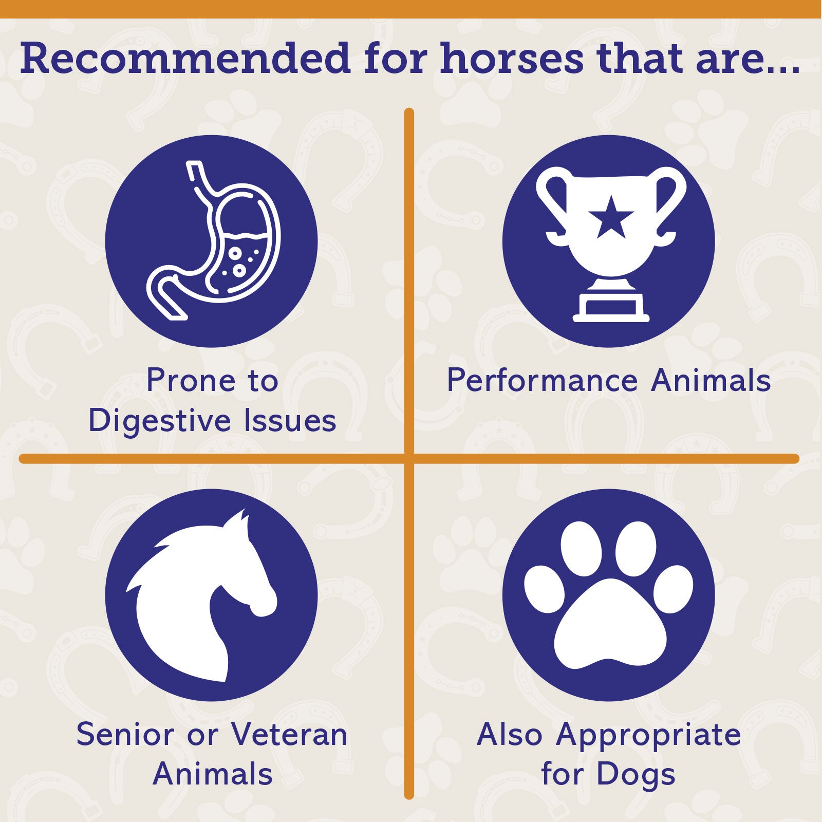 Being low in starch and sugar, it’s safe for horses with metabolic or endocrine conditions like Cushing’s. This unique liquid delivery format also provides surfactant properties to help reduce gas pressure quickly – making it a useful tool during seasonal transitions, feed changes, or stressful travel.