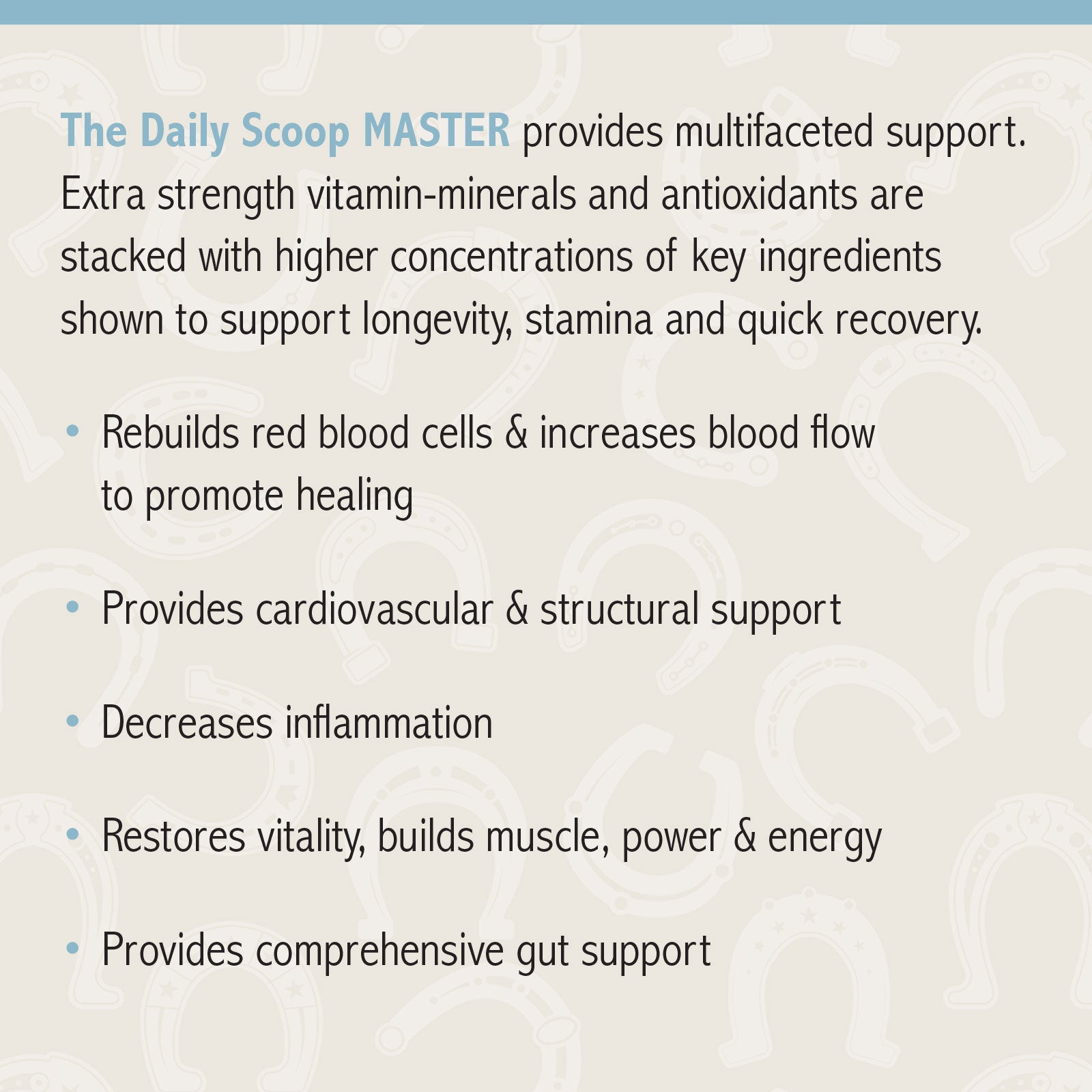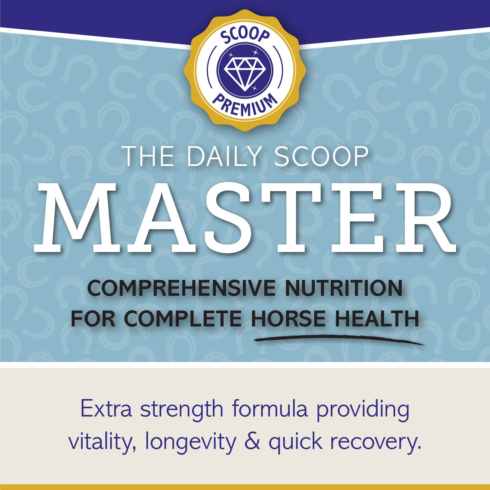 Introducing Daily Scoop: MASTER, a potent blend crafted to elevate your horse's performance and longevity. Building upon the proven foundation of Daily Scoop: ATHLETE, MASTER incorporates additional components to bolster your horse's vitality and overall health.
